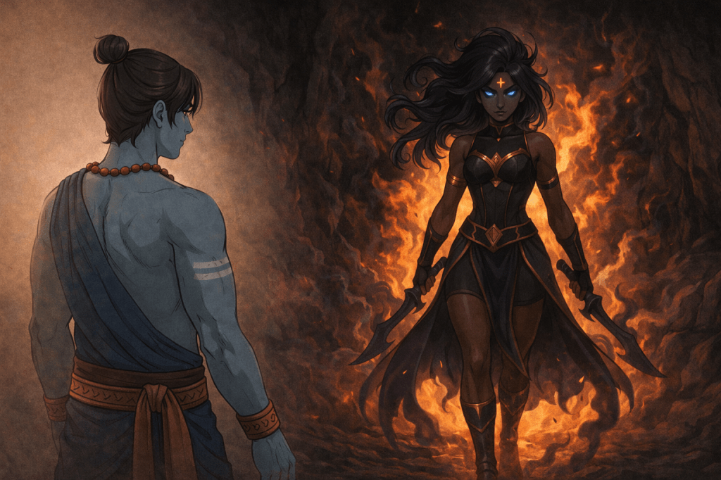 From those shadows and ancient energies, Kaalin arose. She emerged fierce and powerful, formed from darkness, fire, and restless spirits, carrying immense strength within her, yet holding a storm of anger that burned quietly inside. Her presence was intense, and the space around her felt charged, as if even the winds hesitated before moving.