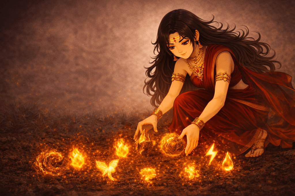 Yashasvita did not rush. One by one, she placed each Tattva upon the ground with great care, pressing her palms to the soil, as if introducing them to the land they were meant to protect.
