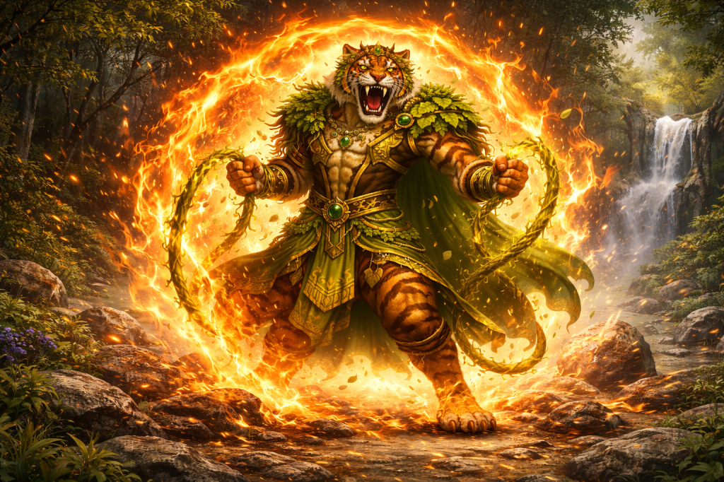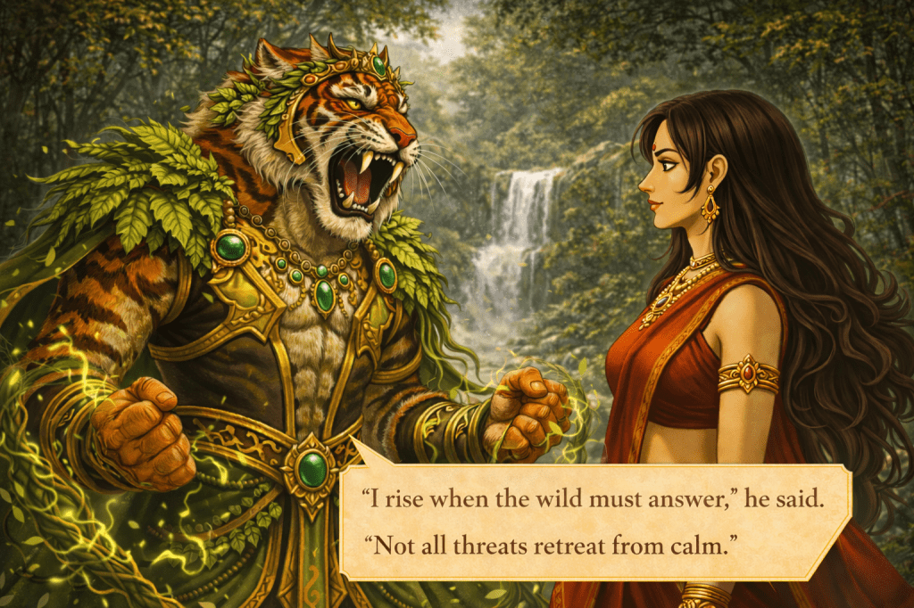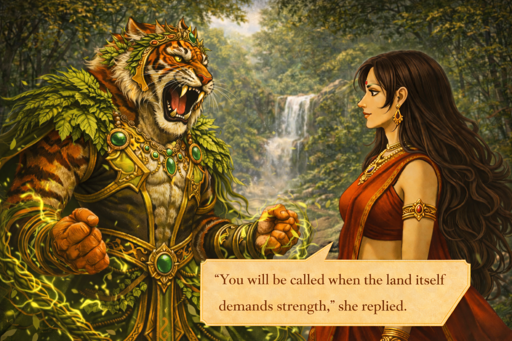 Its energy surged outward, sharp and untamed. The ground shifted as the form of Vyagresh emerged. His body carried the full presence of the great tiger—powerful, alert, and dominant. In his grasp was a living whip, coiled like a vine yet heavy with force, moving as if it shared his will.