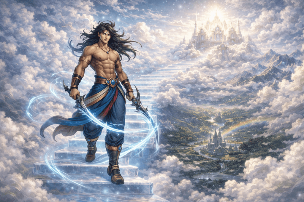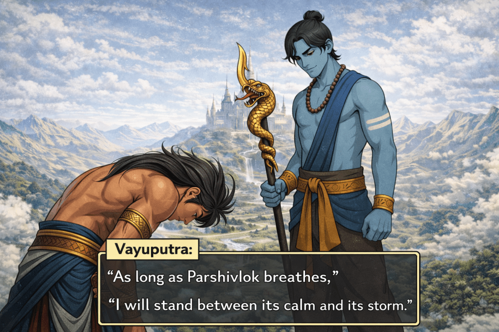 The air softened. The pressure lifted. Trees straightened, rivers settled back into their paths, and Parshivlok gently returned to its place in the sky, as if it had never moved at all. Vayuputra stood quietly, feeling the breath of the world beneath him, until everything was calm once more.