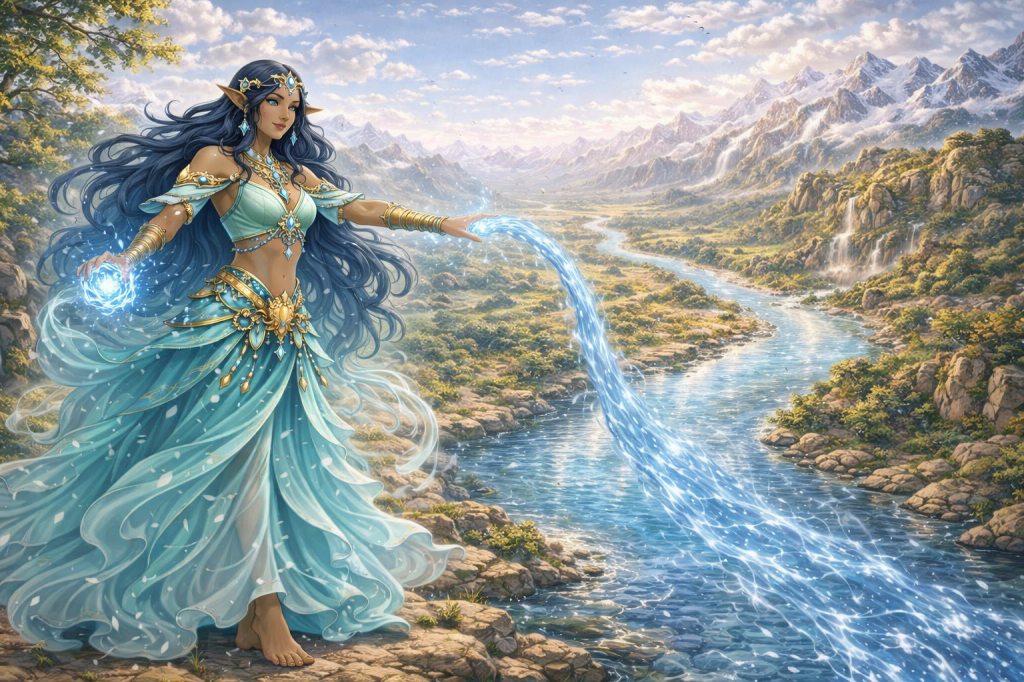 With a graceful motion of her hand, clear waters spread across the land, carving paths that shimmered under the light, forming a wide river that flowed through the heart of the lands prepared for humans.