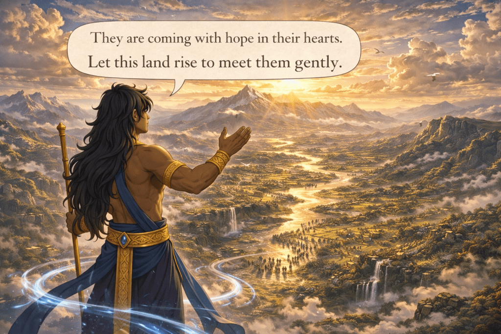 He looked across the wide open lands, still untouched and young, and spoke softly, not to control, but to invite the world to prepare itself.