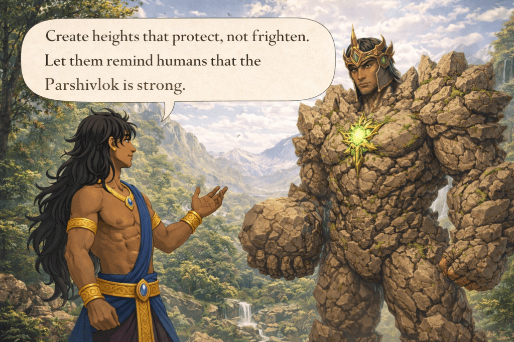 From the depths of Parshivlok rose vast mountain ranges, forming steady walls around the lands meant for humans, standing tall and silent, not as barriers, but as guardians who would watch without interfering.