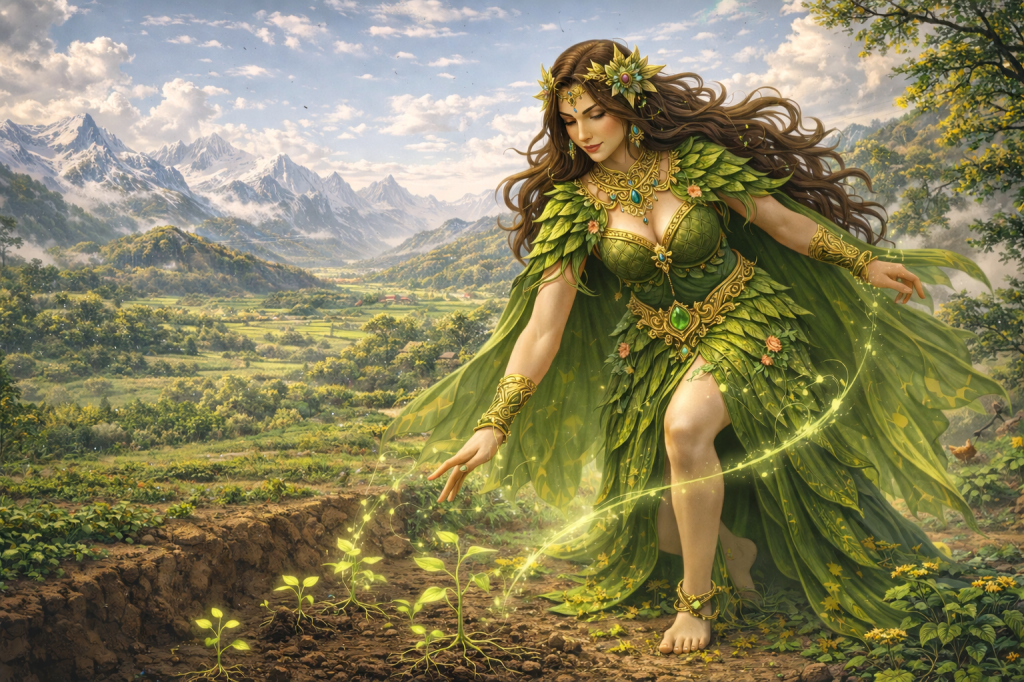 As the mountains settled into place, Dharini moved gently across the land, touching soil, guiding roots, and whispering quietly to seeds, ensuring that the earth would grow food that humans could recognize, trust, and nourish themselves with.