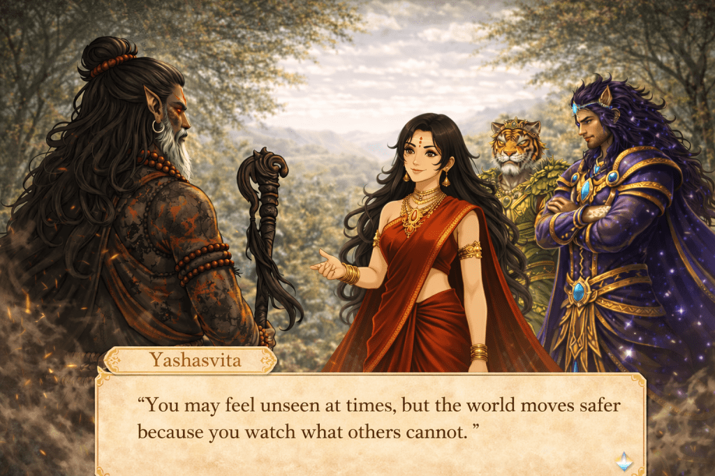 He had watched the humans arrive, had seen their kindness and their calm settling into the land, and though he knew that Yashasvita had chosen wisely, a quiet ache remained within him, not of anger, but of distance, because he had not been part of that choice.