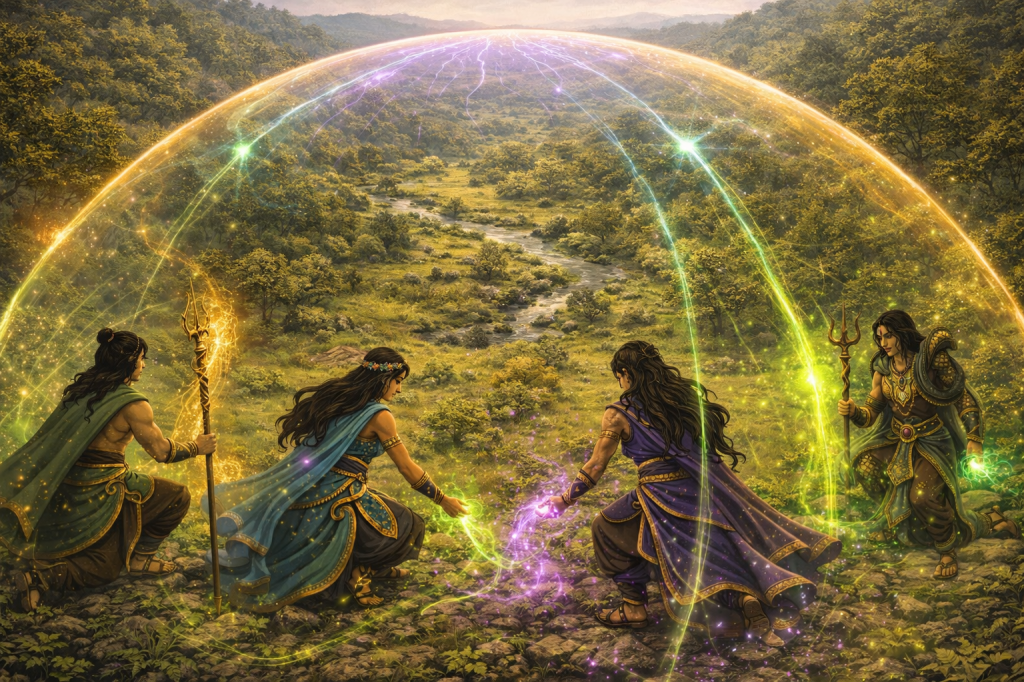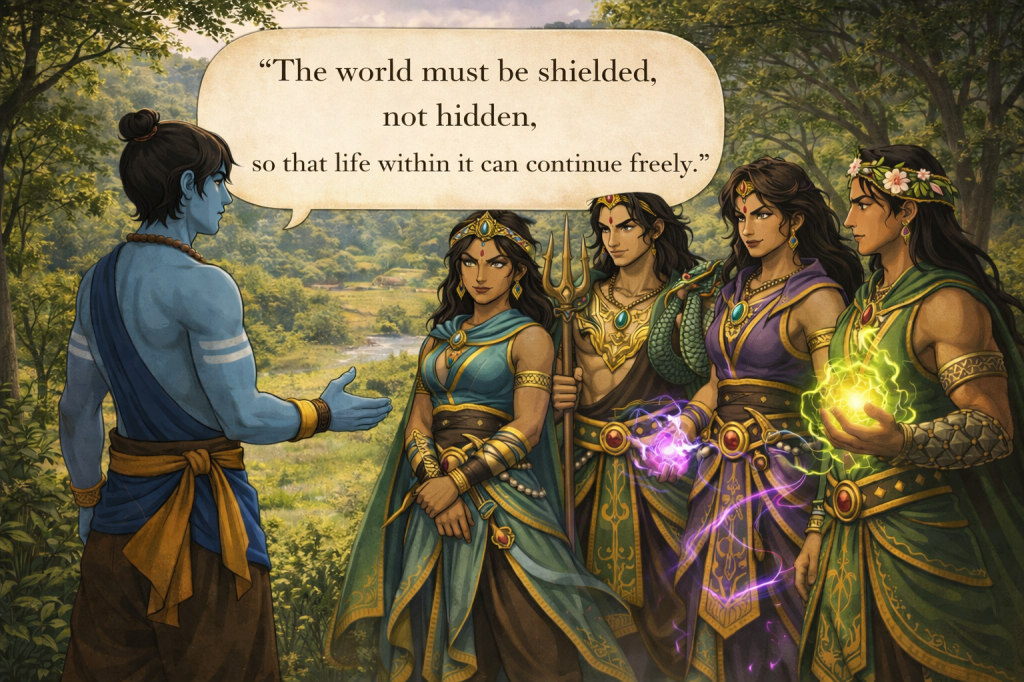 They spread across Parshivlok, their energies weaving through soil, stone, and deep foundations, forming a living shield that did not harden the world, but wrapped it gently, like a quiet promise that danger would not pass easily through.
