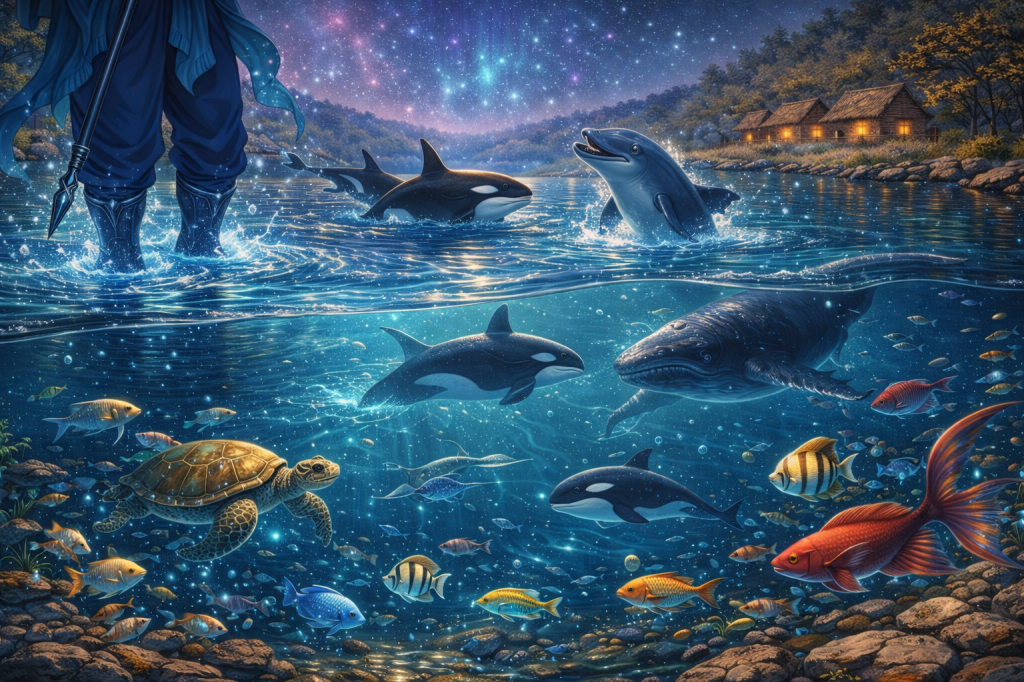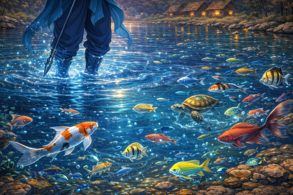 At his presence, the river shifted again, and from beneath the surface came movement, soft at first, then joyful, as fish of many kinds appeared, swimming freely, filling the waters with colour, rhythm, and soundless song.
