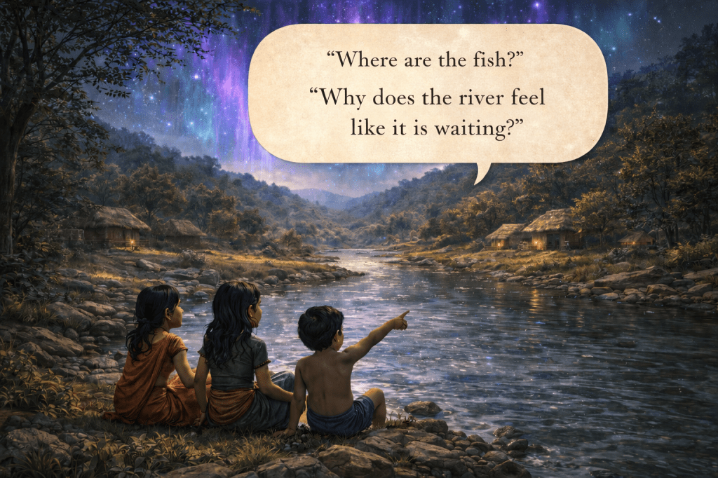 They sat by the river, watching its surface shimmer under Dhruvio’s gentle lights. The water felt kind and safe but nothing swam beneath its surface, leaving the river beautiful, yet strangely empty.