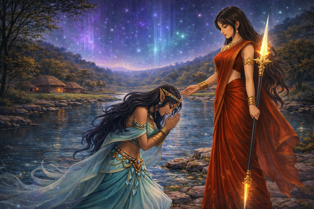 She closed her eyes and Jallika appeared from the flowing river . Yashasvita held it in her hands and the water responded. From the deepest curve of Jeevanrekha, the river stirred, not violently, but with purpose, and from within its clear depths rose Matsyaar.