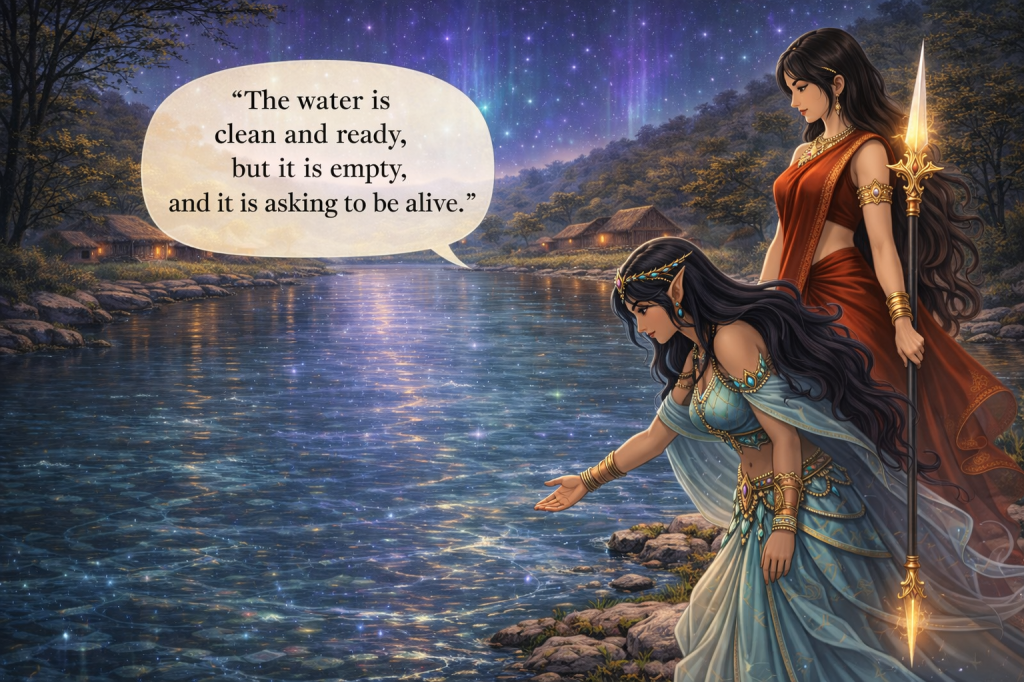 Jalmitra spoke gently, her voice like a stream finding its path- “The water is clean and ready, but it is empty, and it is asking to be alive.”